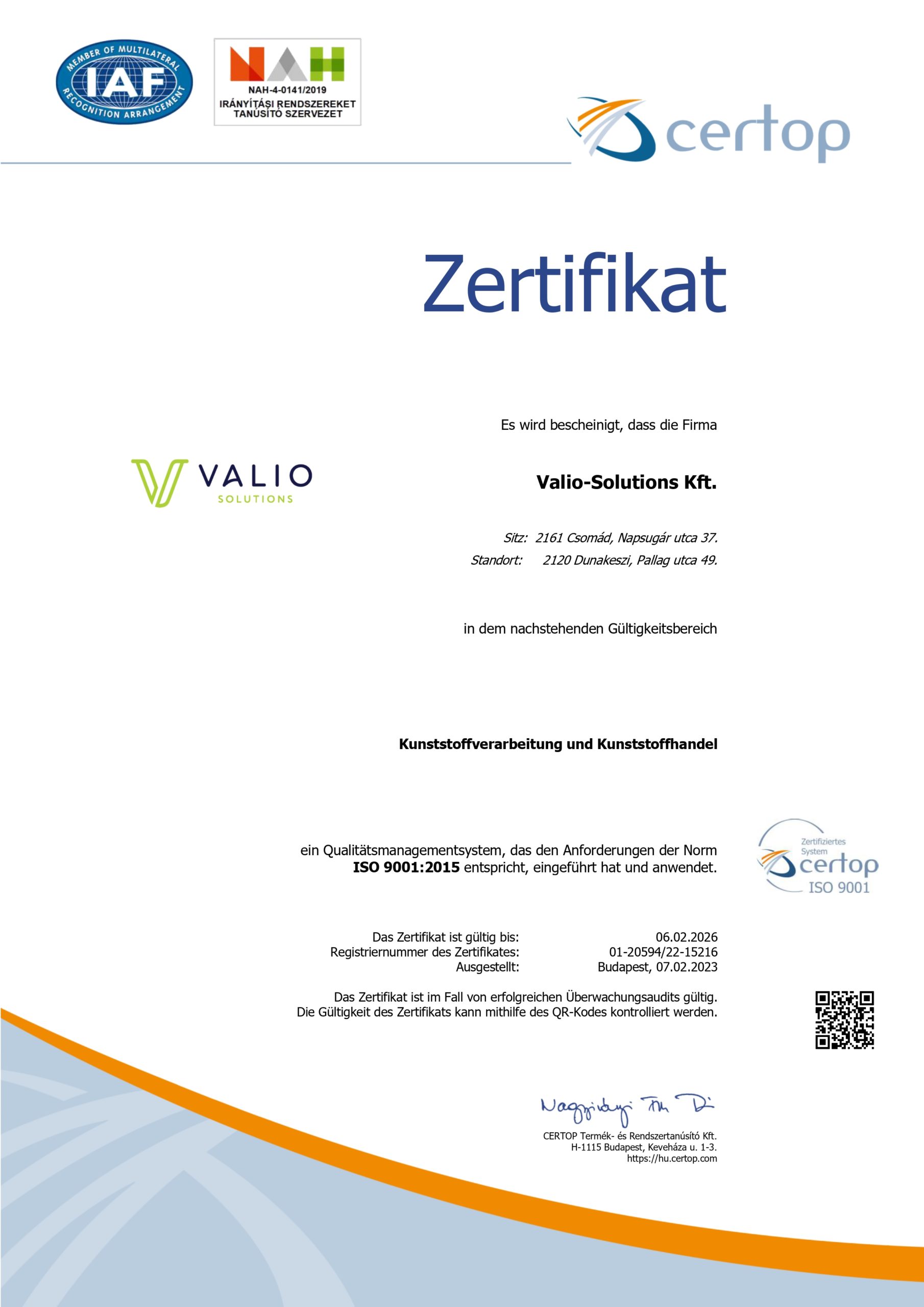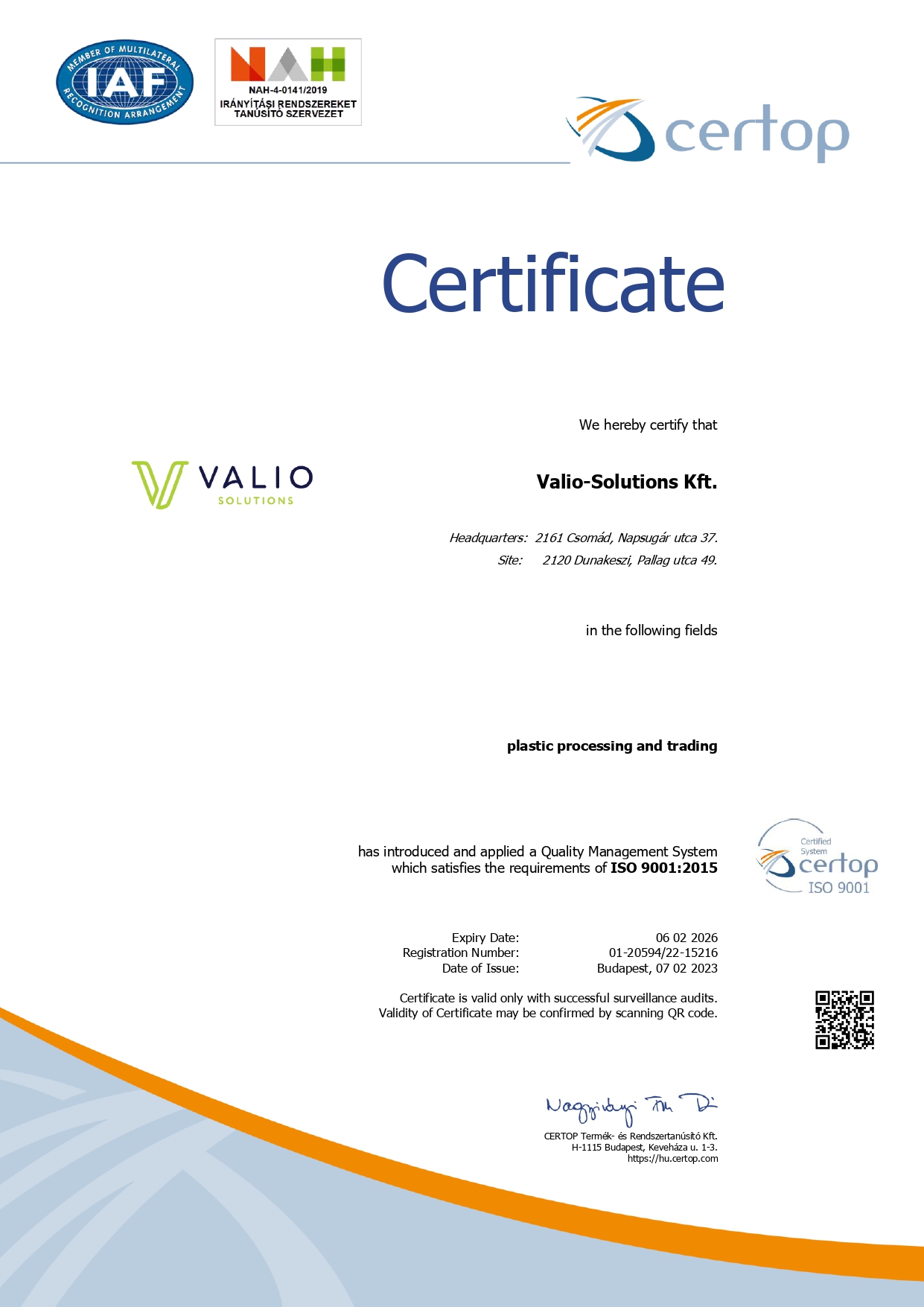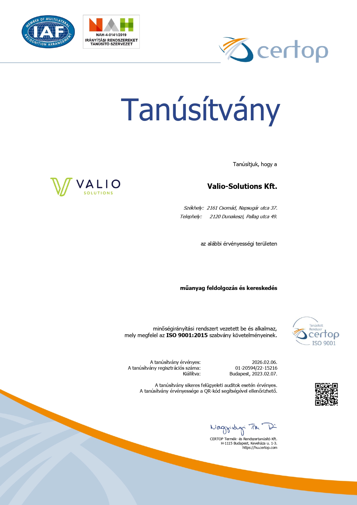 Büszkék vagyunk arra, hogy a műanyag-feldolgozás és kereskedelem területén olyan minőségirányítási rendszert működtetünk, amely megfelel az ISO 9001:2015 szabvány valamennyi követelményének.